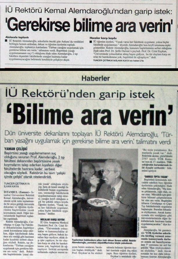 İstanbul Üniversitesi Rektörü Kemal Alemdaroğlu’nun 14 Mart 1998’de dekanlarını toplayarak verdiği “örtü yasağını uygulamak için gerekirse bilime ara verin” talimatı, dönemin ruhunu özetleyen en çarpıcı itiraf olarak kayıtlara geçti.