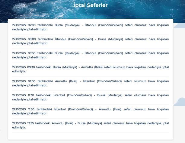 BUDO’nun internet sitesinden yapılan açıklamada, Marmara Denizi’nde etkili olması beklenen şiddetli rüzgar ve dalga boyunun sefer güvenliğini olumsuz etkileyeceği belirtilerek, bazı hatlarda karşılıklı seferlerin gerçekleştirilemeyeceği duyuruldu. Yapılan açıklamaya göre, 07.00 Bursa (Mudanya) - İstanbul (Eminönü/Sirkeci), 08.00 İstanbul (Eminönü/Sirkeci) - Bursa (Mudanya), 09.30 Bursa (Mudanya) - İstanbul (Eminönü/Sirkeci), 09.30 Bursa (Mudanya) - Armutlu (İhlas), 10.00 Armutlu (İhlas) - İstanbul (Eminönü/Sirkeci), 11.30 İstanbul (Eminönü/Sirkeci) - Bursa (Mudanya), 11.30 İstanbul (Eminönü/Sirkeci) - Armutlu (İhlas), 12.55 tarihindeki Armutlu (İhlas) - Bursa (Mudanya) seferleri olumsuz hava koşulları nedeniyle yapılamayacak.