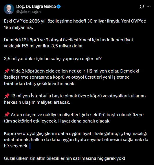 Gökçe, "Eski OVP'de 2026 yılı özelleştirme hedefi 30 milyar liraydı. Yeni OVP'de 185 milyar lira. Demek ki 2 köprü ve 9 otoyol özelleştirmesi için hedeflenen fiyat yaklaşık 155 milyar lira. 3,5 milyar dolar. 3,5 milyar dolar için bu satışı yapmaya değer mi?" ifadelerini kullandı.
