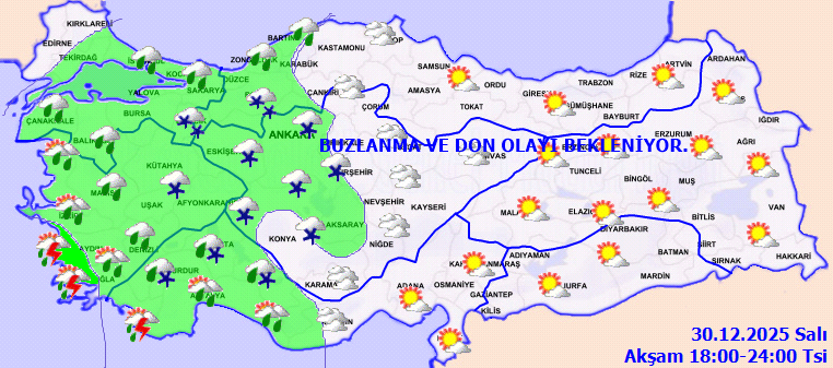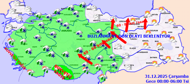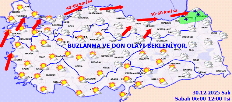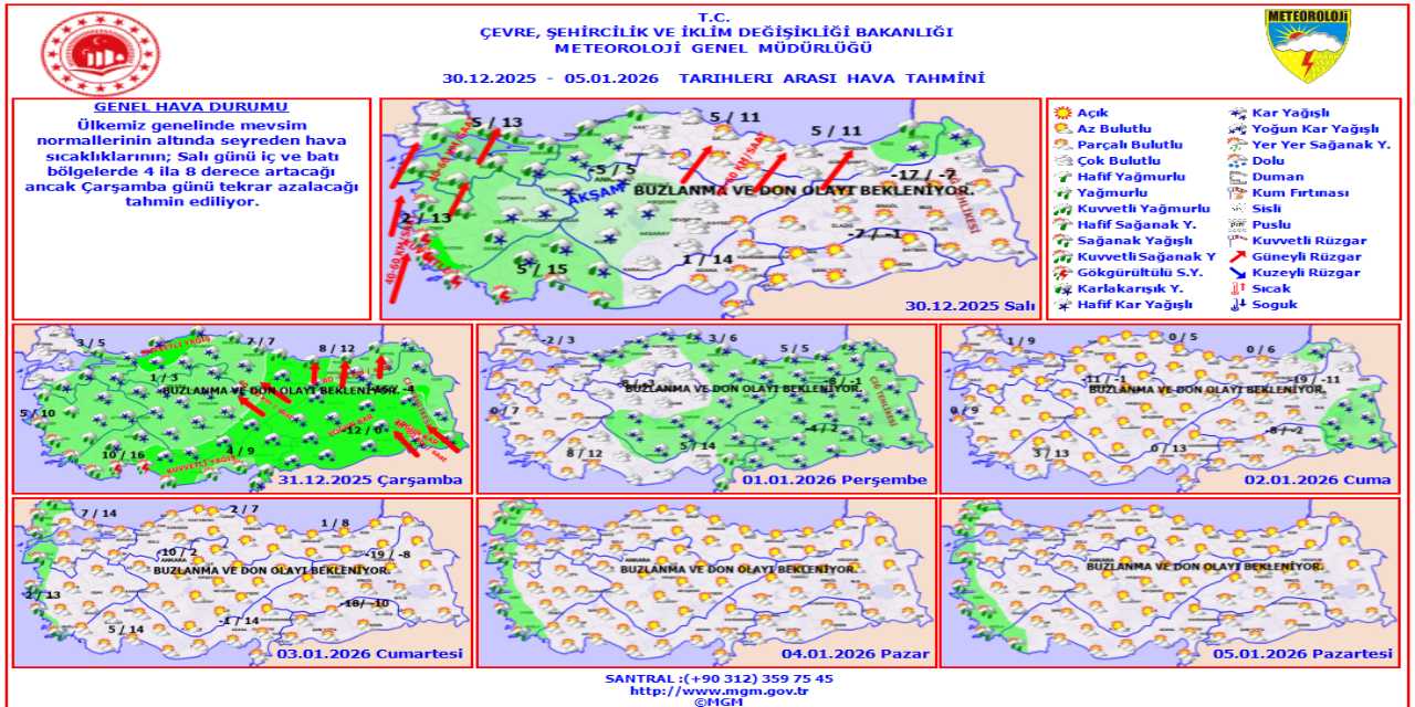 BUZLANMA VE DON OLAYI UYARISI: Kuzey, iç ve doğu kesimlerde buzlanma ve don olayı beklendiğinden yaşanabilecek olumsuzluklara karşı dikkatli ve tedbirli olunması gerekmektedir.