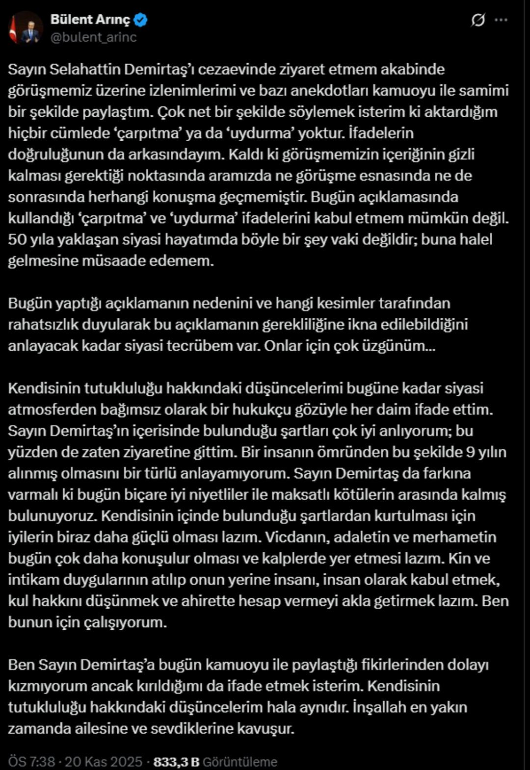Eski TBMM Başkanı Bülent Arınç'ın Edirne Cezaevi'nde tutuklu bulunan eski HDP Eş Genel Başkanı Selahattin Demirtaş'ı ziyareti ses getirdi. Ziyaretin ardından Bülent Arınç, Demirtaş'ın Cumhurbaşkanı Recep Tayyip Erdoğan ile görüşmek ve "Size karşı kin duymuyorum" demek istediğini öne sürmüştü.