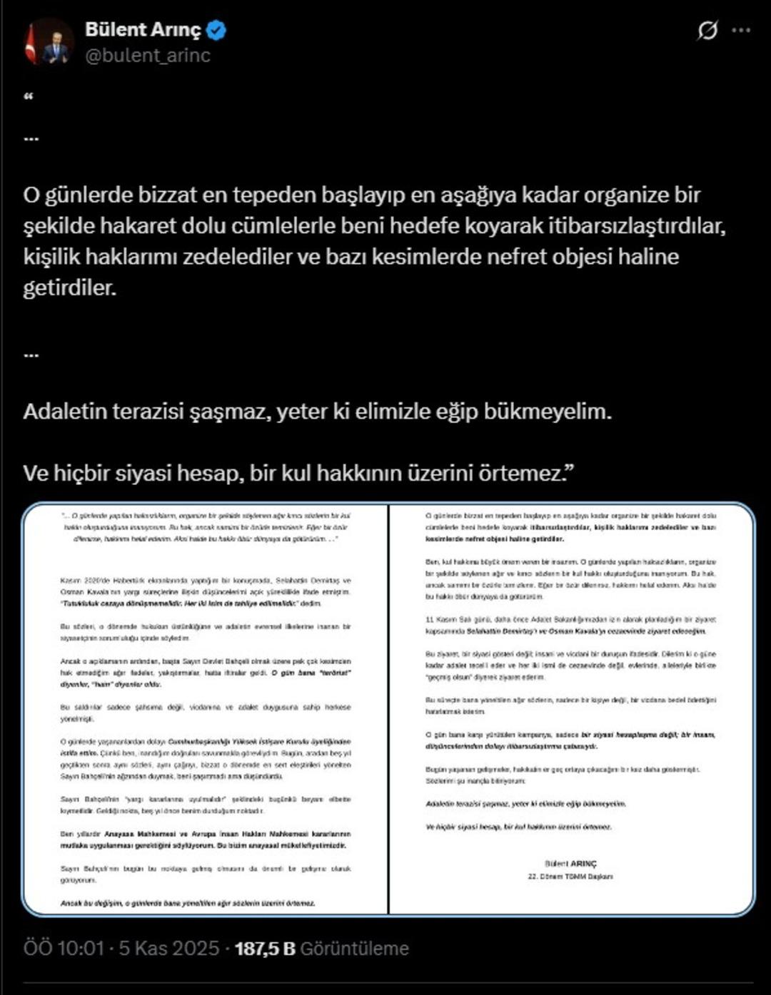 Eski Başbakan Yardımcısı ve eski TBMM Başkanı Bülent Arınç sosyal medya hesabından açıklamalarda bulundu. 11 Kasım'da Selahattin Demirtaş ve Osman Kavala'yı ziyaret edeceğini aktaran Arınç, açıklamasında 5 yıl öncesini hatırlattı ve MHP Genel Başkanı Devlet Bahçeli'yi eleştirdi.