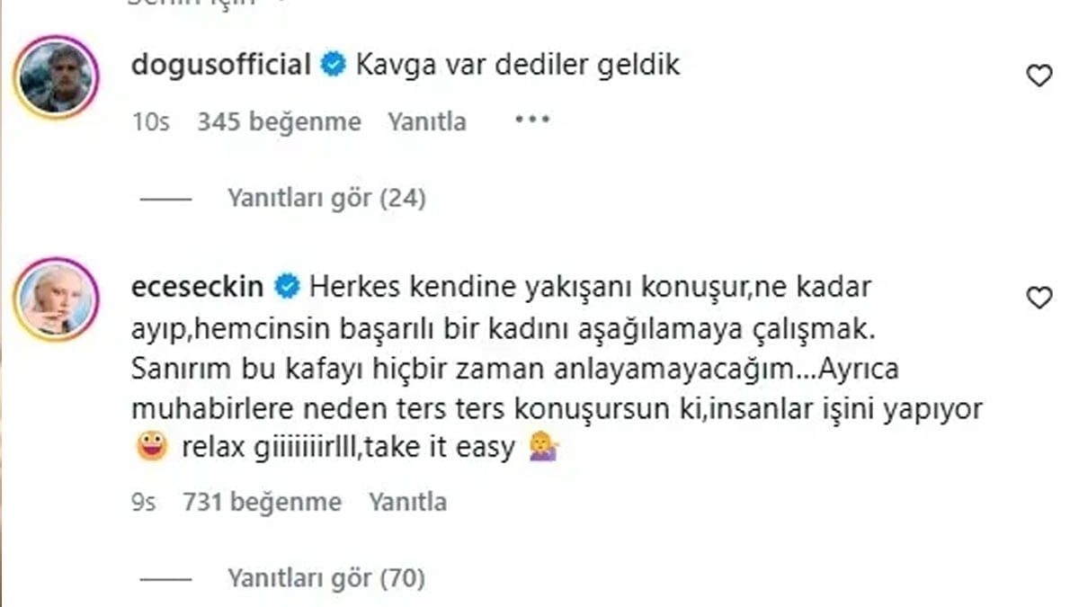 Tartışmaya şarkıcı Doğuş ise esprili bir yorumla dahil oldu. Sosyal medyada polemiği takip eden Doğuş, Burcu Güneş’in sözlerinin altına “Kavga var dediler geldik” notunu düşerek dikkat çekti.