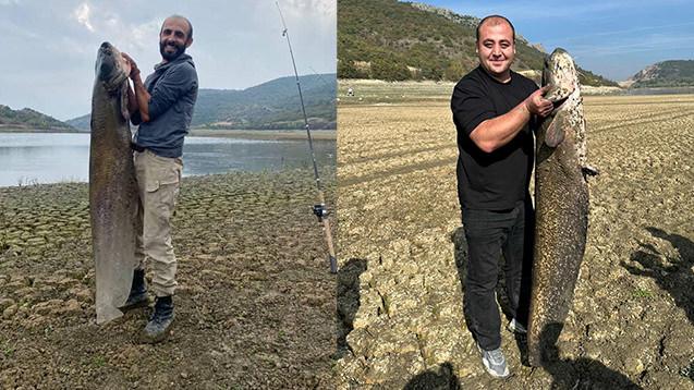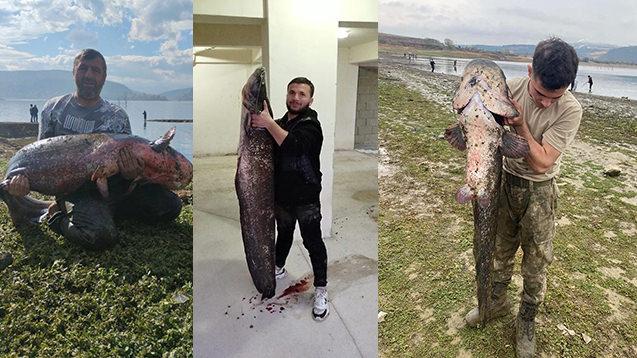 Bursa'nın İnegöl ilçesindeki Boğazköy Barajı'nda su seviyesinin düşmesiyle birlikte, vatandaşlar kıyıya daha yakın alanlarda görülen dev yayın balıklarını avlamaya başladı.