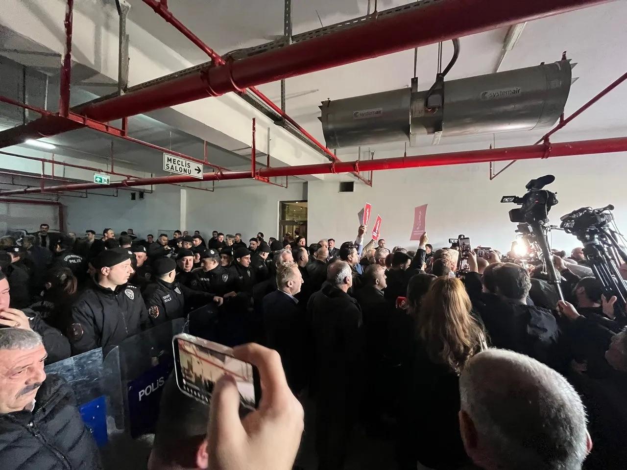 Seçim öncesi güvenlik güçleri, yalnızca meclis üyelerinin binaya girişine izin verirken, yaklaşık 200 kişilik CHP’li grup kararı hiçe sayarak bariyerleri zorladı.