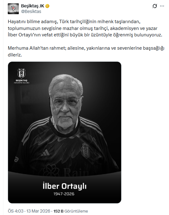 BEŞİKTAŞ FORMALI PAYLAŞIMSiyah-Beyazlı kulüp, Ortaylı’nın vefatı üzerine bir mesaj yayımladı. Açıklamada, “Hayatını bilime adamış, Türk tarihçiliğinin mihenk taşlarından İlber Ortaylı’nın vefatını büyük bir üzüntüyle öğrenmiş bulunuyoruz. Merhuma Allah’tan rahmet; ailesine, yakınlarına ve sevenlerine başsağlığı dileriz” denildi.