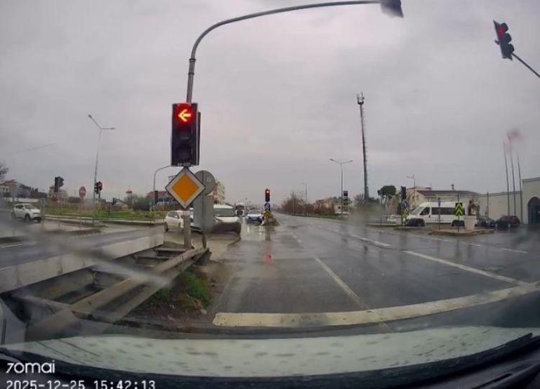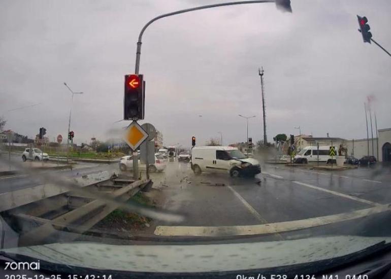 Kaza anı başka bir sürücünün araç içi kamerasıyla kaydedildi. Görüntülerde, sürücüsünün kırmızı ışıkta durmadığı hafif ticari aracın, karşı yönden gelen otomobille çarpıştığı anlar yer aldı.