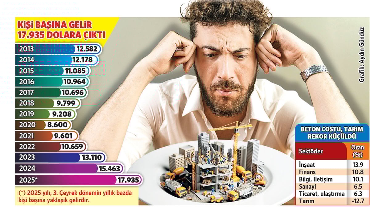 İşçisinden emeklisine, çiftçisinden esnafına, tüccarından sanayicisine kadar kötü ekonominin darbe vurduğu dört bir yandan feryatlar yükselirken, ekonomi kağıt üstünde yine büyümüş göründü. Büyüme ağırlıklı olarak betona yapılan yatırımların geçici etkisiyle elde edildi. Halkın doğrudan mutfağını ilgilendiren tarım sektörü ise yüzde 12.7 gibi olağanüstü oranda küçüldü. Bu veriler, yoksulun tenceresinin önümüzdeki dönemde daha pahalı kaynayacağını, geçmişte kendi kendine yeten Türkiye’nin daha fazla tarım ithalatına yöneleceğinin sinyali oldu. Türkiye İstatistik Kurumu (TÜİK) gayri safi yurtiçi hasılanın (GSYH) temmuz-ağustos, eylül aylarını kapsayan 3’üncü çeyrek döneminde geçen yılın aynı dönemine göre yüzde 3.7 oranında büyüdüğünü hesapladı. Büyüme bir önceki çeyreğe göre ise yüzde 1.1’de kaldı.