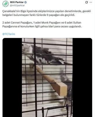 DKMP Genel Müdürlüğü'nün sanal medya hesabından yapılan açıklamaya göre; Çanakkale’nin Biga ilçesinde DKMP ekiplerince yapılan denetimlerde, gerekli belgeleri bulunmayan farklı türlerde 9 papağan ele geçirildi. 2 adet Cennet Papağanı, 1 adet Monk Papağanı ve 6 adet Sultan Papağanı'na el konulurken, ilgili kişiye idari para cezası uygulandı.
