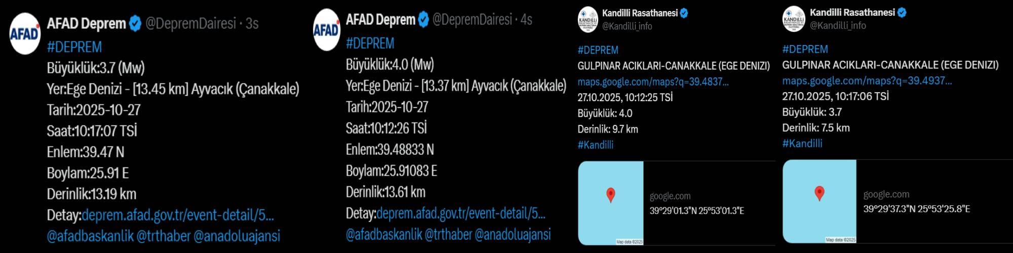 AFAD ve Kandilli Rasathanesi, Çanakkale'nin Ayvacık ilçesi açıklarında 4 ve 3.7 büyüklüğünde iki deprem meydana geldiğini bildirdi.