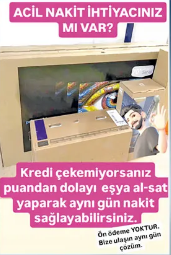 32 yaşındaki vatandaş “Bankadan kredi alamadım. Çocuğum hastaydı, acil para lazımdı. Beni bir numara yönlendirdi. 60 bin liralık telefon aldım, elime 38 bin lira verdiler. Şimdi her ay 5 bin lira ödüyorum. Toplamda 60 bin lira geri ödeyeceğim. Mecbur kaldım ama pişmanım” dedi. Bu yöntem daha çok sosyal medyada mesajlaşma uygulamaları üzerinden ‘Nakit ihtiyacına çözüm’, ‘SGK’lıya anında para’, ‘Alışverişe aracılık’ gibi sözlerle duyuruluyor. İlanlarda faiz yerine ‘hizmet bedeli’ sözlerini sarf etti.