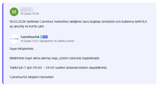Türkiye'nin önde gelen süpermarket zincirlerinden Carrefour, bu kez hijyen skandalıyla gündeme geldi. Bir vatandaş, marketten satın aldığı buğdayın son kullanma tarihinin 8.5 ay geçtiğini ve ürünün kurtlandığını belirterek Şikayet Var'a yazdı.