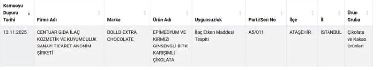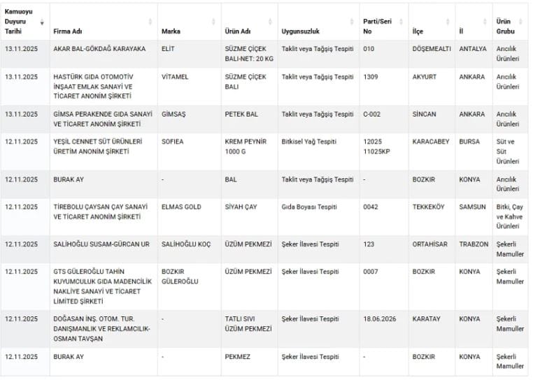Listede pekmez, bal, siyah çay ve krem peynir gibi ürünler yer aldı. Son testlerde, bazı markaların ‘pekmez’ ibaresiyle sattığı üründe şeker olduğu, balda taklit veya tağşiş bulunduğu belirlendi. Çikolatada ilaç, siyah çayda ise boya çıktı.