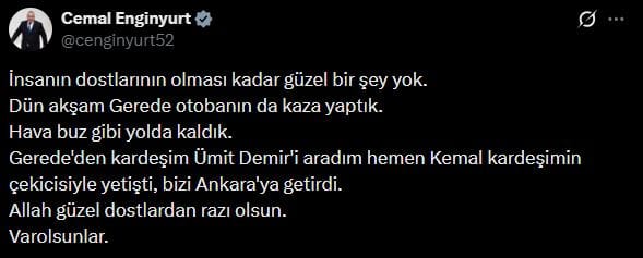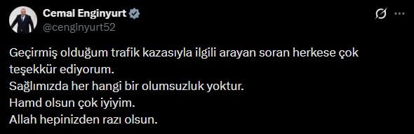 "SAĞLIĞIMIZDA HERHANGİ BİR OLUMSUZLUK YOK"Kazanın ardından arayan ve mesaj atan herkese teşekkür eden Enginyurt, sağlık durumuyla ilgili merak edilenleri de giderdi. Bir paylaşım daha yaparak "Hamd olsun çok iyiyim. Sağlığımızda herhangi bir olumsuzluk yoktur" ifadelerini kullanan milletvekili, kendilerine yardım eden dostlarına da özel olarak teşekkür etti.