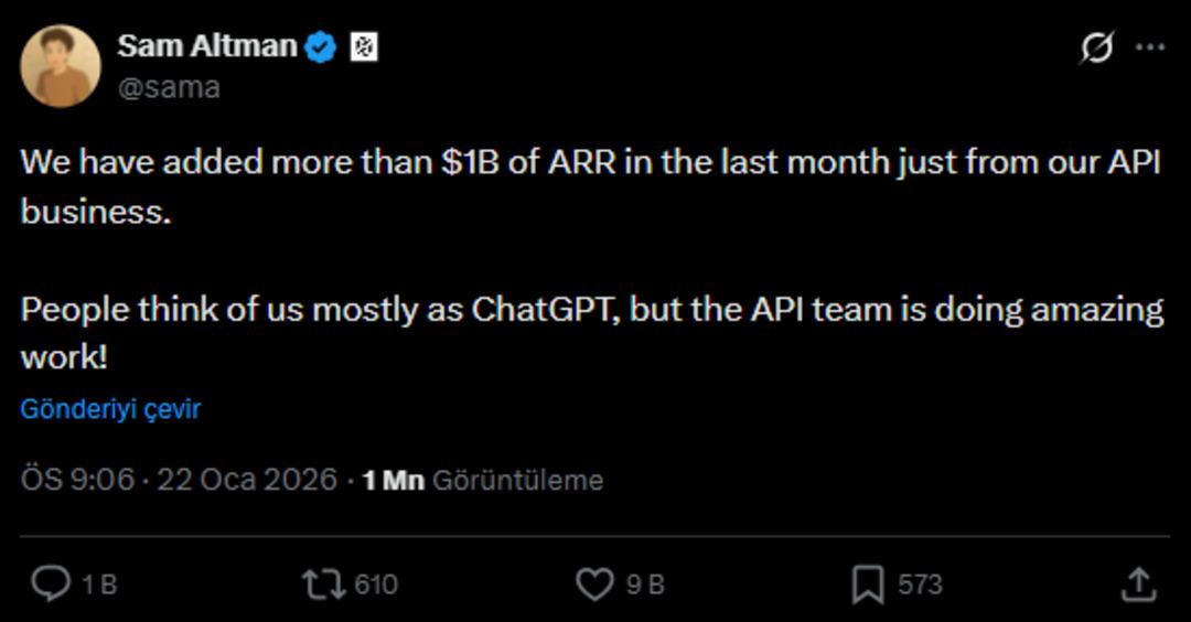 1 MİLYAR DOLARDAN FAZLA!Sam Altman, X'te yaptığı bir paylaşımda, OpenAI'ın sadece API işinden geçen ay 1 milyar dolardan fazla yıllık tekrarlayan gelir (ARR) elde ettiğini açıkladı.