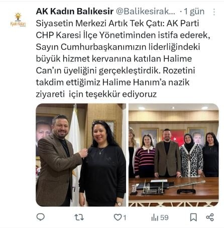 Siyasetin Merkezi Artık Tek Çatı: AK Parti- CHP Karesi İlçe Yönetiminden istifa ederek, Sayın Cumhurbaşkanımızın liderliğindeki büyük hizmet kervanına katılan Halime Can’ın üyeliğini gerçekleştirdik. Rozetini takdim ettiğimiz Halime Hanım’a nazik ziyareti için teşekkür ediyoruz.