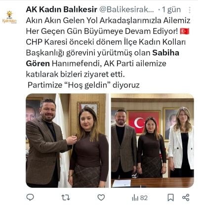CHP Karesi önceki dönem İlçe Kadın Kolları Başkanı Sabiha Gören ve Halime Can, CHP Karesi İlçe Yönetiminden istifa etti. Gören ve Can, AKP'ye katıldı.