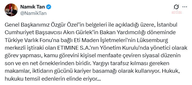 "Genel Başkanımız Özgür Özel’in belgeleri ile açıkladığı üzere, İstanbul Cumhuriyet Başsavcısı Akın Gürlek’in Bakan Yardımcılığı döneminde Türkiye Varlık Fonu'na bağlı Eti Maden İşletmeleri'nin Lüksemburg merkezli iştiraki olan ETIMINE S.A.'nın Yönetim Kurulu'nda yönetici olarak görev yapması, kamu görevini kişisel menfaate çeviren siyasal düzenin son ve en net örneklerinden biridir. Yargıyı tarafsız kılması gereken makamlar, iktidarın gücünü kariyer basamağı olarak kullanıyor. Hukuk, hukuku temsil edenlerin elinde eriyor"