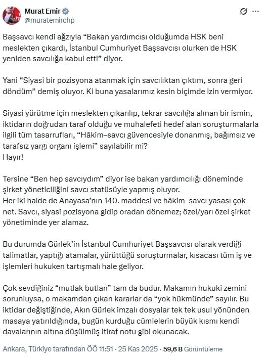 Başsavcı Akın Gürlek’in röportajdaki "Başsavcı kendi ağzıyla 'Bakan yardımcısı olduğumda HSK beni meslekten çıkardı, İstanbul Cumhuriyet Başsavcısı olurken de HSK yeniden savcılığa kabul etti'" sözlerini eleştiren Murat Emir, Gürlek'in görevinden ayrılma ve geri dönme süreci için yasaların kesin olarak izin vermediğini söyledi.