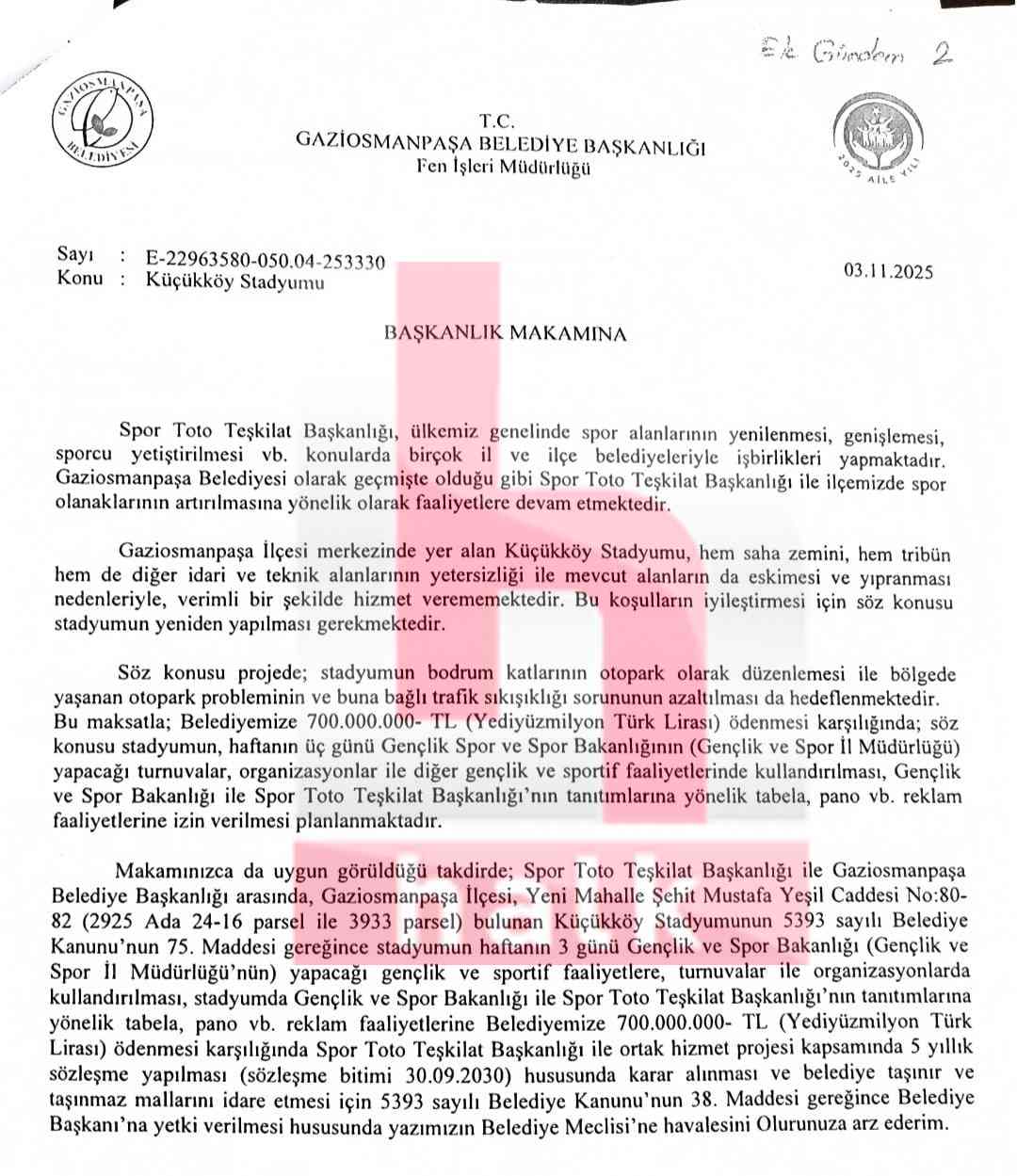 CHP’li Belediye Başkanı Hakan Bahçepe’nin tutuklanmasının ardından başkanvekili seçimiyle AKP yönetimine geçen Gaziosmanpaşa Belediyesi, dev bir yatırım kararına imza attı. Belediye Meclisi’ne sunulan teklife göre, Spor Toto Teşkilat Başkanlığı, Küçükköy Stadyumu’nun yenilenmesi için 700 milyon TL kaynak sağlayacak.