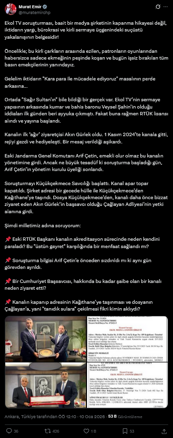 "Ekol TV soruşturması, basit bir medya şirketinin kapanma hikayesi değil, iktidarın yargı, bürokrasi ve kirli sermaye üçgenindeki suçüstü yakalanışının belgesidir!