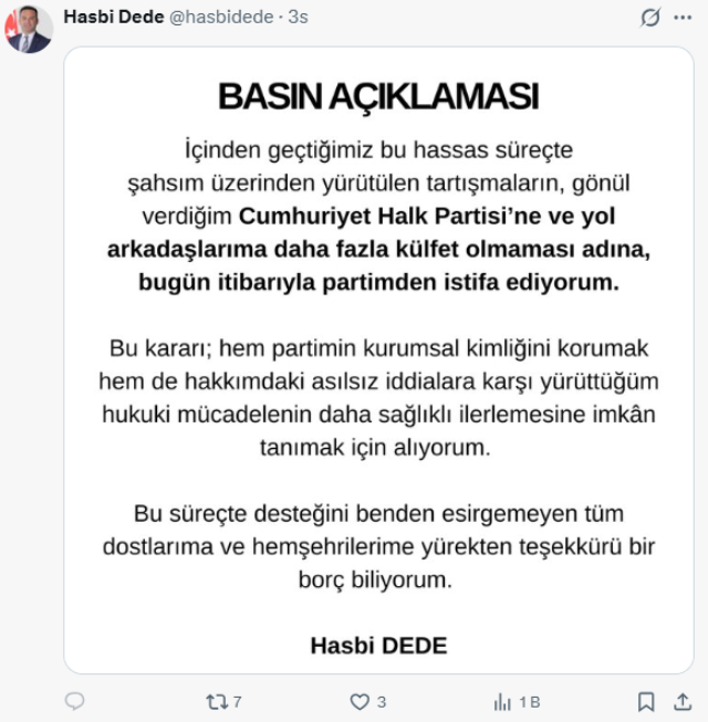 “HUKUKİ SÜRECİ DAHA SAĞLIKLI YÜRÜTECEĞİM"Kararını, hem partisinin kurumsal kimliğini korumak hem de hakkındaki iddialara karşı yürüttüğü hukuki süreci daha sağlıklı ilerletmek amacıyla aldığını belirten Dede, kendisine destek verenlere teşekkür etti.