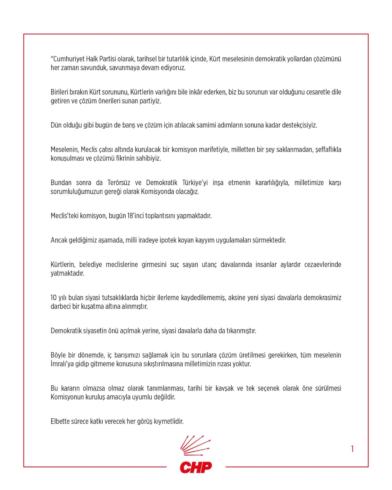 Cumhuriyet Halk Partisi olarak, tarihsel bir tutarlılık içinde, Kürt meselesinin demokratik yollardan çözümünü her zaman savunduk, savunmaya devam ediyoruz.