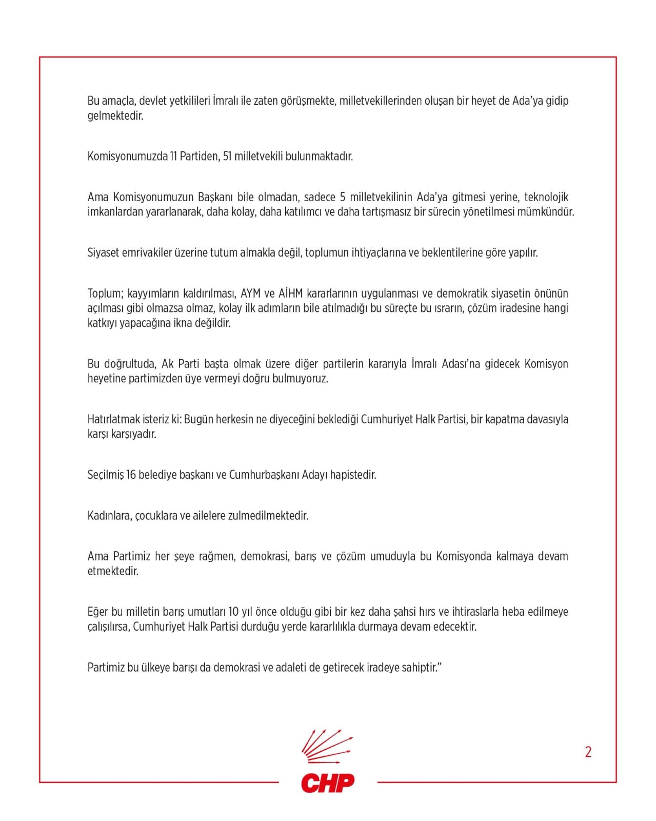 Cumhuriyet Halk Partisi, İmralı'ya gidecek olası bir heyete üye vermeme kararına ilişkin yazılı açıklama yayımladı.