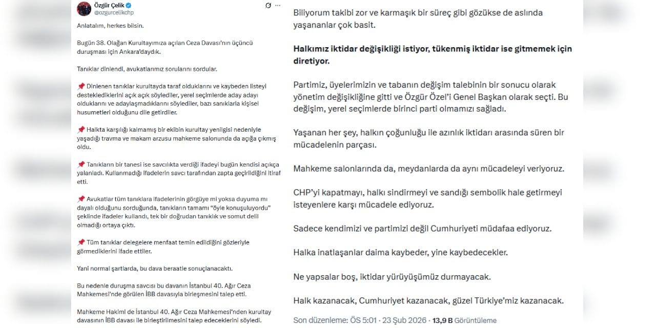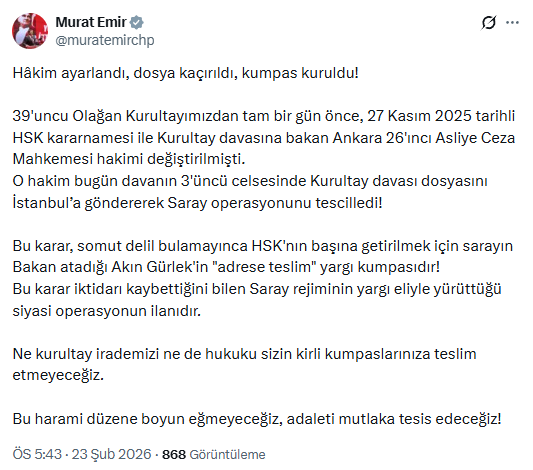 CHP Grup Başkanvekili Murat Emir'in X paylaşımı (23 Şubat 2026)GÜL ÇİFTÇİ"Partimizin 38’inci Olağan Kurultayı’na ilişkin ceza davasında, yargılamanın hangi zeminde yürütüldüğü bugün bir kez daha açık biçimde ortaya çıkmıştır.