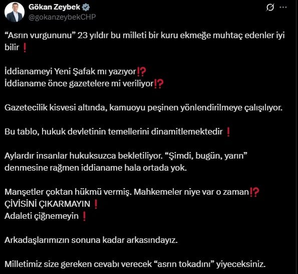 “Asrın vurgununu 23 yıldır bu milleti bir kuru ekmeğe muhtaç edenler iyi bilir. İddianameyi Yeni Şafak mı yazıyor? İddianame önce gazetelere mi veriliyor? Gazetecilik kisvesi altında, kamuoyu peşinen yönlendirilmeye çalışılıyor. Bu tablo, hukuk devletinin temellerini dinamitlemektedir.”