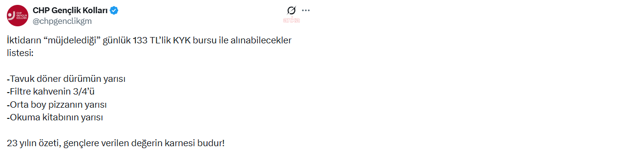 Listenin yanı sıra CHP Gençlik Kolları paylaşımında, "23 yılın özeti, gençlere verilen değerin karnesi budur" notunu düştü.