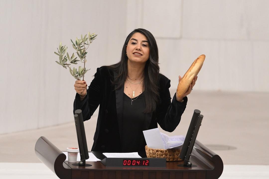 Genel Kurul görüşmeleri sırasında söz alıp, kürsüye ekmek sepeti ve zeytin dalı ile çıkan DEM Parti Şanlıurfa Milletvekili Dilan Kunt Ayan, "Elbette ki iktidar sıralarından sürecin ruhuna uygun konuşma yapanları ayrı tutuyorum. Yürekten söylüyorum; ağzınıza, yüreğinize sağlık arkadaşlar, umarım bunun devamı gelir ama bazı iktidar vekillerinden barış dilinden uzak ve süreci sindirememiş sözler dinledik. Bazı bakanların ağzından düşmeyen o kelimeler; 'Savunma sanayisi, İHA'lar, SİHA'lar, S-400'ler, F-16'lar, füzeler'. Bu kürsüde böylesi bir süreçte savaş uçaklarını koyarak utanmadan, sıkılmadan konuşmalar yaptılar. Terörist siyaseti yaptılar ama ben bu kürsüye nasıl çıktım biliyor musunuz? Bakın, bir elimde zeytin dalı, bir elimde ekmekle çıktım. Niye biliyor musunuz? Çünkü burası savaşın reklamlarının yapılacağı kürsüler değil, burası halkın hayat kürsüsüdür. Bu kürsüden silahın değil, bu kürsüden siyasetin sözünün yükselmesi gerekir. Peki, neden yürüyüşümüze, 'Ekmek ve barış' dedik biliyor musunuz? Çünkü ekmek olmadan barış olmaz, barış olmadan da ekmek olmaz" ifadelerini kullandı.