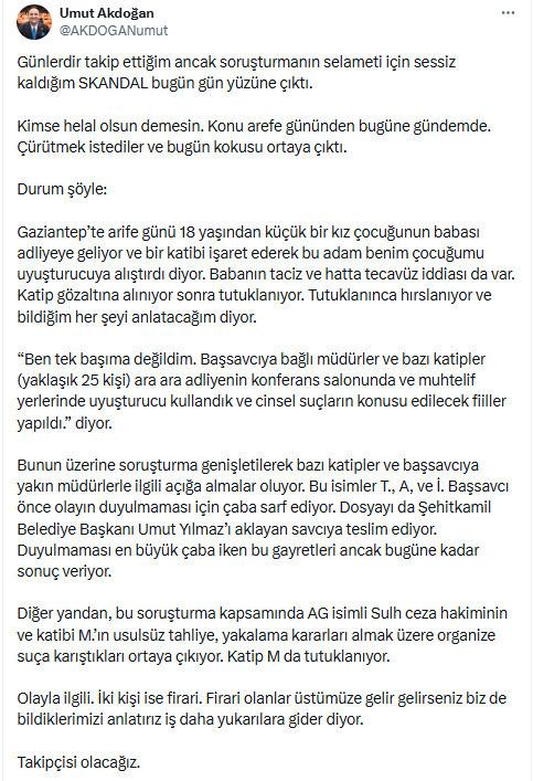 "Konu arefe gününden bugüne gündemde. Çürütmek istediler ve bugün kokusu ortaya çıktı. Durum şöyle: Gaziantep'te arefe günü 18 yaşından küçük bir kız çocuğunun babası adliyeye geliyor ve bir katibi işaret ederek 'Bu adam benim çocuğumu uyuşturucuya alıştırdı' diyor. Babanın taciz ve hatta tecavüz iddiası da var. Katip gözaltına alınıyor, sonra tutuklanıyor. Tutuklanınca hırslanıyor ve 'Bildiğim her şeyi anlatacağım' diyor."