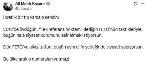 Paylaşımında Tayyar’ın 2012 yılına ait bir videosuna da yer veren Başarır, “2012’de övdüğün, ‘tek referans noktam’ dediğin FETÖ’nün taktikleriyle bugün hâlâ siyaset kurumunu esir almak istiyorsun. Dün FETÖ’ye alkış tuttun, bugün aynı dilin yedeğinde siyaset yapıyorsun. Bu ülke artık o numaraları yutmaz!” ifadelerini kullandı.