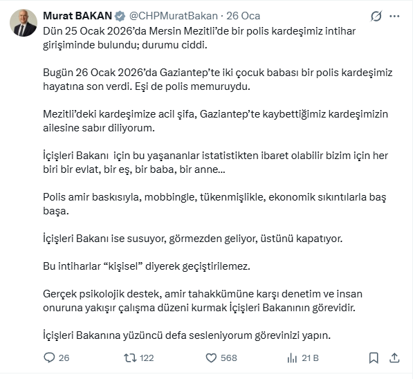 "Dün 25 Ocak 2026’da Mersin Mezitli’de bir polis kardeşimiz intihar girişiminde bulundu; durumu ciddi. Bugün 26 Ocak 2026’da Gaziantep’te iki çocuk babası bir polis kardeşimiz hayatına son verdi. Eşi de polis memuruydu. Mezitli’deki kardeşimize acil şifa, Gaziantep’te kaybettiğimiz kardeşimizin ailesine sabır diliyorum.