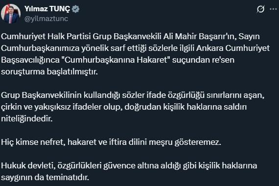 "RE'SEN SORUŞTURMA BAŞLATILDI"Sosyal medya hesabından açıklama yapan Tunç, "Cumhuriyet Halk Partisi Grup Başkanvekili Ali Mahir Başarır'ın, Sayın Cumhurbaşkanımıza yönelik sarf ettiği sözlerle ilgili Ankara Cumhuriyet Başsavcılığınca "Cumhurbaşkanına Hakaret" suçundan re'sen soruşturma başlatılmıştır" dedi.