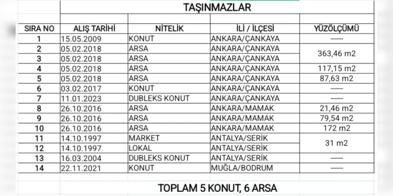 Bulunduğumuz sitenin sosyal tesisi (market ve lokal olduğu iddia edilen) ve havuzunda sitede oturan onlarca kişiyle birlikte hakkımız olduğu için sistemde üç ayrı tapu gibi görünmektedir. Sitede hak sahibi olan herkesin sisteminde bu durum görülmektedir. Ankara sınırları içerisinde bulunan ve toplam yedi ayrı tapu olarak görünen arsalardan, aynı parselde bulunan dört tanesi 2018 yılında edinilmiş olup, toplam büyüklüğü 567 metrekaredir. Aynı şekilde Mamak’ta aynı parselde üç tapu olarak görünen arsanın da toplam büyüklüğü 272 metrekare olup; bunun asıl arsaya ait olan kısmı 172 metrekaredir ve kalan miktar maddi değeri olmayan terkin alanlarından ibarettir.