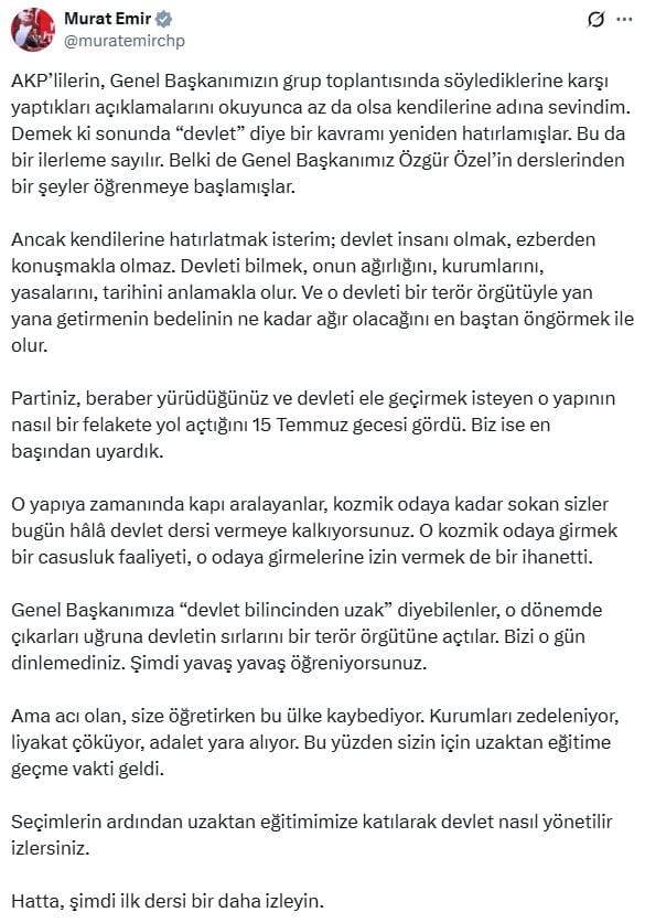 CHP Grup Başkan Vekili Murat Emir'in 'X' paylaşımı (4.11.2025)"UZAKTAN EĞİTİMİMİZE KATILARAK DEVLET NASIL YÖNETİLİR İZLERSİNİZ""Genel Başkanımıza “devlet bilincinden uzak” diyebilenler, o dönemde çıkarları uğruna devletin sırlarını bir terör örgütüne açtılar. Bizi o gün dinlemediniz. Şimdi yavaş yavaş öğreniyorsunuz. Ama acı olan, size öğretirken bu ülke kaybediyor. Kurumları zedeleniyor, liyakat çöküyor, adalet yara alıyor. Bu yüzden sizin için uzaktan eğitime geçme vakti geldi. Seçimlerin ardından uzaktan eğitimimize katılarak devlet nasıl yönetilir izlersiniz. Hatta, şimdi ilk dersi bir daha izleyin."