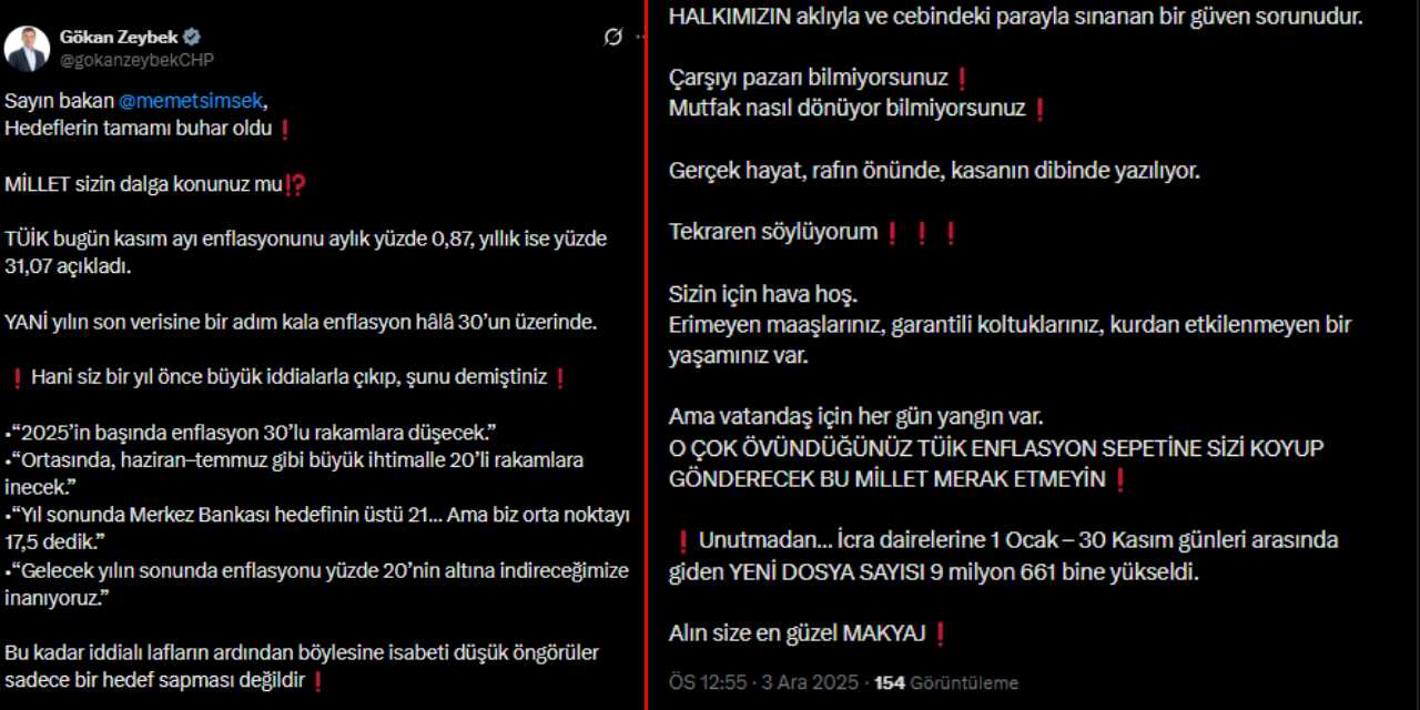 Şimşek'in enflasyonun kademeli olarak 17,5'lik yıl sonu hedefine düşeceği iddiasını hatırlatan Zeybek, enflasyonun hala yüzde 30'un üzerinde seyretmesinin bir hedef sapması değil, halkın aklıyla ve cebindeki parayla sınanan bir güven sorunu olduğunu söyledi.