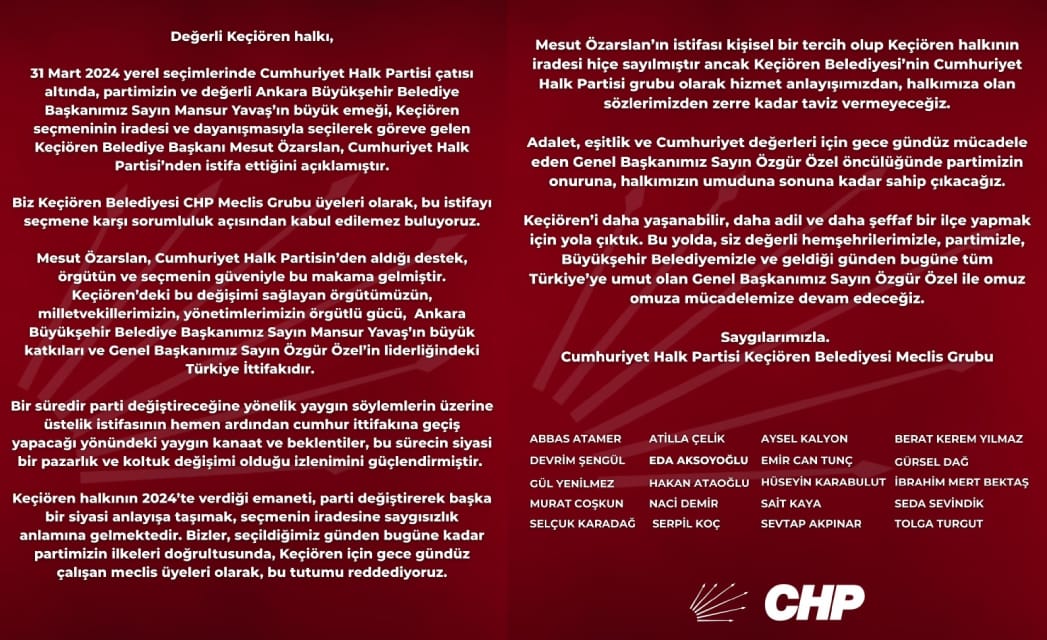 "Mesut Özarslan’ın istifası kişisel bir tercih olup Keçiören halkının iradesi hiçe sayılmıştır; ancak Keçiören Belediyesi’nin Cumhuriyet Halk Partisi grubu olarak hizmet anlayışımızdan, halkımıza olan sözlerimizden zerre kadar taviz vermeyeceğiz.Adalet, eşitlik ve Cumhuriyet değerleri için gece gündüz mücadele eden Genel Başkanımız Sayın Özgür Özel öncülüğünde partimizin onuruna, halkımızın umuduna sonuna kadar sahip çıkacağız.Keçiören’i daha yaşanabilir, daha adil ve daha şeffaf bir ilçe yapmak için yola çıktık. Bu yolda, siz değerli hemşehrilerimizle, partimizle, Büyükşehir Belediyemizle ve geldiği günden bugüne tüm Türkiye’ye umut olan Genel Başkanımız Sayın Özgür Özel ile omuz omuza mücadelemize devam edeceğiz."