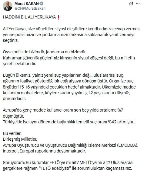 BAKAN YERLİKAYA'YA SERT YANITMurat Bakan sosyal medya hesabından şu ifadeleri kullandı: