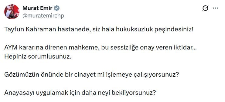 "Tayfun Kahraman hastanede, siz hala hukuksuzluk peşindesiniz! AYM kararına direnen mahkeme, bu sessizliğe onay veren iktidar… Hepiniz sorumlusunuz. Gözümüzün önünde bir cinayet mi işlemeye çalışıyorsunuz? Anayasayı uygulamak için daha neyi bekliyorsunuz?"