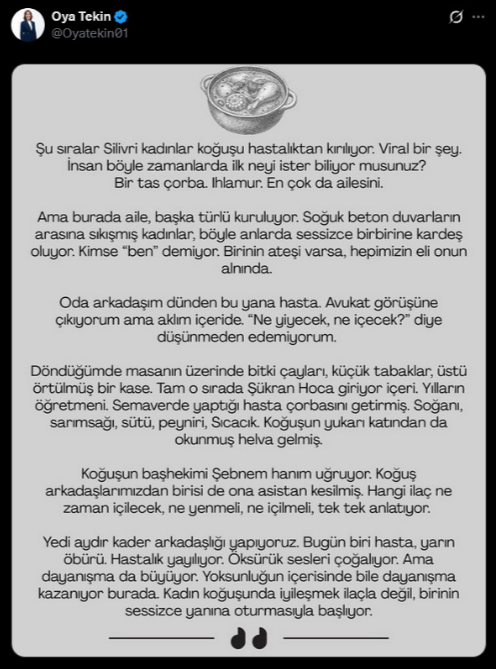 SİLİVRİ’DE SALGIN HASTALIK VE DAYANIŞMAKararın ardından Silivri Cezaevi’nde bulunan Oya Tekin, sosyal medya hesabı üzerinden kadınlar koğuşundaki yaşamı ve son günlerde yayılan hastalık sürecini anlattı. Tekin, koğuşta salgının etkili olduğunu belirterek, cezaevi şartlarında ailenin yerini "kader arkadaşlığı"nın aldığını vurguladı.