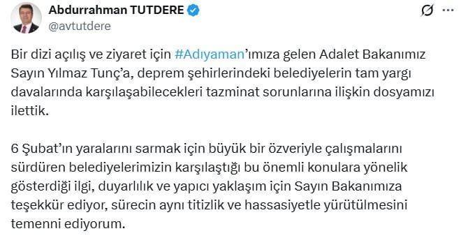 "Bir dizi açılış ve ziyaret için Adıyaman’ımıza gelen Adalet Bakanımız Sayın Yılmaz Tunç’a, deprem şehirlerindeki belediyelerin tam yargı davalarında karşılaşabilecekleri tazminat sorunlarına ilişkin dosyamızı ilettik. 6 Şubat’ın yaralarını sarmak için büyük bir özveriyle çalışmalarını sürdüren belediyelerimizin karşılaştığı bu önemli konulara yönelik gösterdiği ilgi, duyarlılık ve yapıcı yaklaşım için Sayın Bakanımıza teşekkür ediyor, sürecin aynı titizlik ve hassasiyetle yürütülmesini temenni ediyorum."