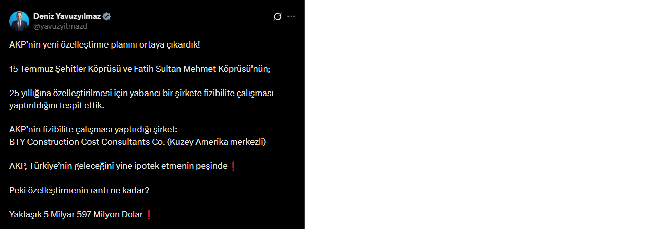 CHP Genel Başkan Yardımcısı ve Zonguldak Milletvekili Deniz Yavuzyılmaz, "AKP'nin yeni özelleştirme planı" diyerek, 15 Temmuz Şehitler Köprüsü ve Fatih Sultan Mehmet Köprüsü'nün 25 yıllığına özelleştirilmesi için yabancı bir şirkete fizibilite çalışması yaptırıldığını söyledi.