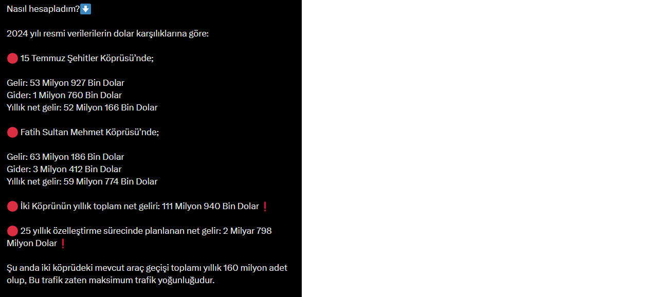 Bu tutarın, devletin bu iki köprüyü işletirken elde ettiği halihazırdaki net geliri olduğunu ifade etti.