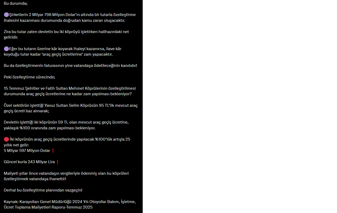 Özel sektörün işlettiği Yavuz Sultan Selim Köprüsü'nde yapılacak zammı örnek gösteren Yavuzyılmaz, diğer iki köprünün de özelleştirilmesi durumunda buradan sağlanacak rantın 5 milyar 597 milyon dolar (güncel kurla yaklaşık 243 milyar lira) olacağını söyledi.