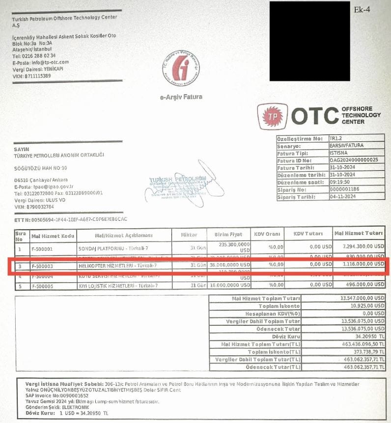 Sondaj gemilerine alınan helikopter hizmetleri için, Katar ortaklı bir helikopter kiralama şirketine yaptığı devasa tutardaki ödemeleri tespit ettik.