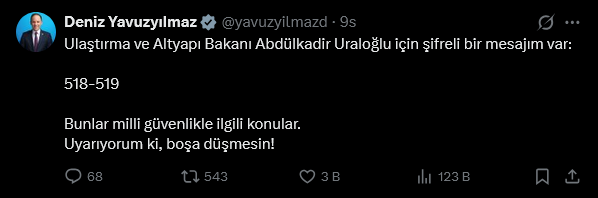 Paylaşımında şu ifadeleri kullandı: “Ulaştırma ve Altyapı Bakanı Abdülkadir Uraloğlu için şifreli bir mesajım var: 518-519”