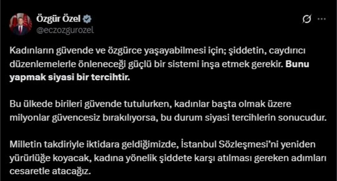 CHP lideri Özgür Özel, sosyal medya hesabından Kadına Yönelik Şiddete Karşı Uluslararası Mücadele Günü nedeniyle yaptığı paylaşımda iktidara gelmeleri durumunda 'İstanbul Sözleşmesi'ni yeniden yürürlüğe koyacaklarını duyurdu.
